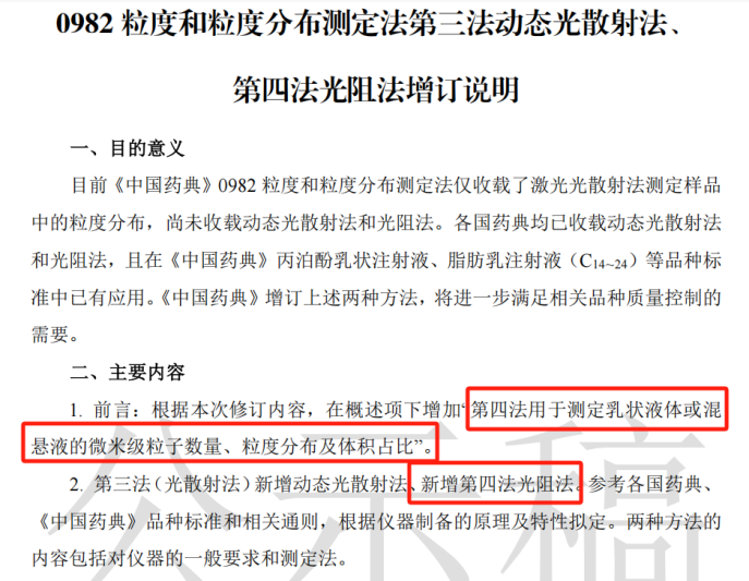 【中國藥典】0982中要求,中/長鏈脂肪乳注射液大乳粒照粒度和粒度分布測定法或照動態(tài)光散射法檢查,體積平均粒徑或光強平均粒徑不得過0.50μm;另取本品,照基于單粒子光學(xué)傳感技術(shù)的光阻法測定,大于5μm的乳粒加權(quán)總體積不得過油相體積的0.05%。
